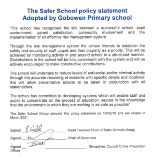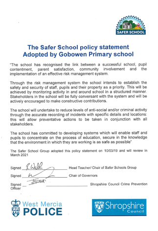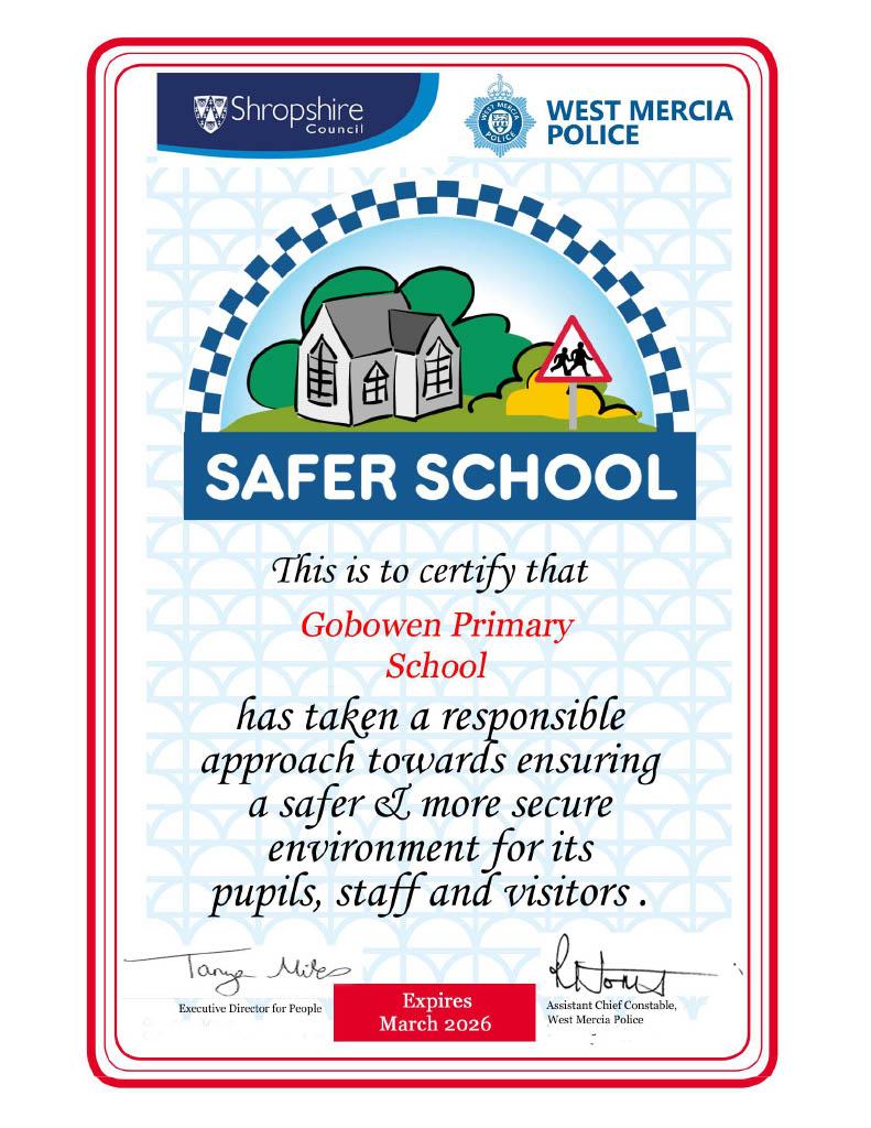 West Mercia Police and Shropshire Council support our school with the Safer School initiative. We are an accredited ‘Safer School’ and proud of our Safer School sign and certificate. The accreditation is reviewed every two years.